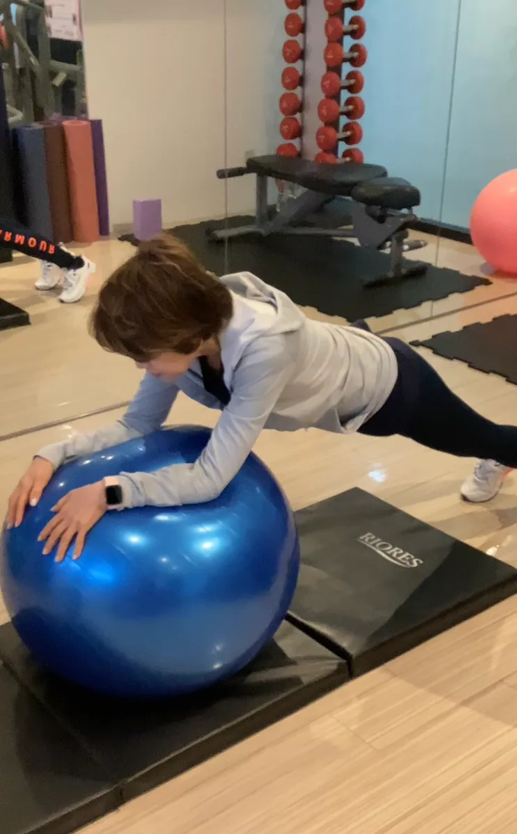 バランスボールの上でお腹をしっかり固定したままプランクをし、その体勢で腕だけを前に動かします❣